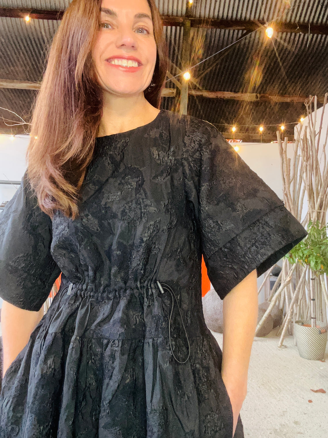 There is a drawstring to excentuate the waist and a zip closure at the back.