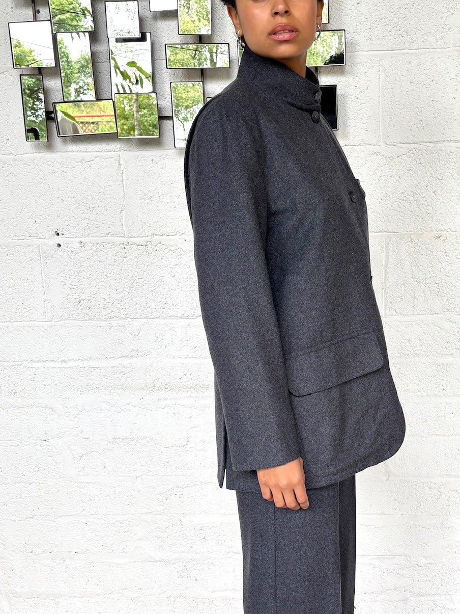 Nikri Jacket is a wool-mix suit jacket with drop-waist detailing on the back.