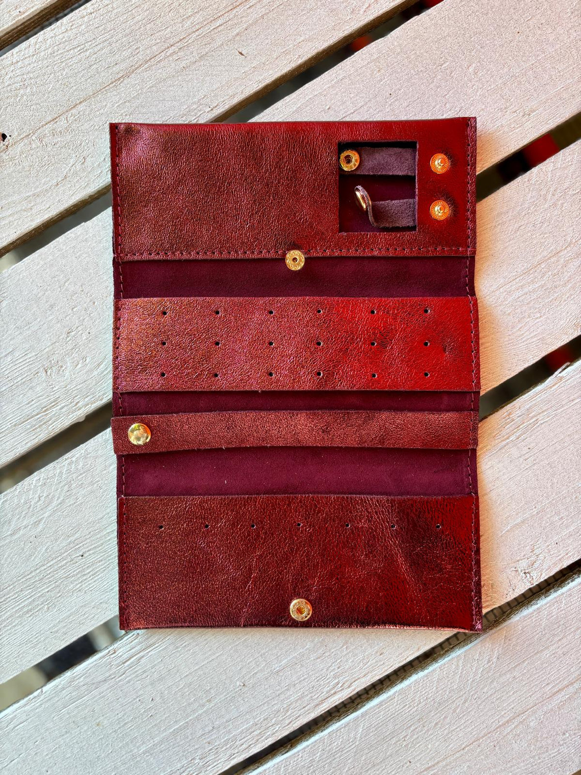 This pouch comes in either a metallic rose gold or a metallic mulberry.