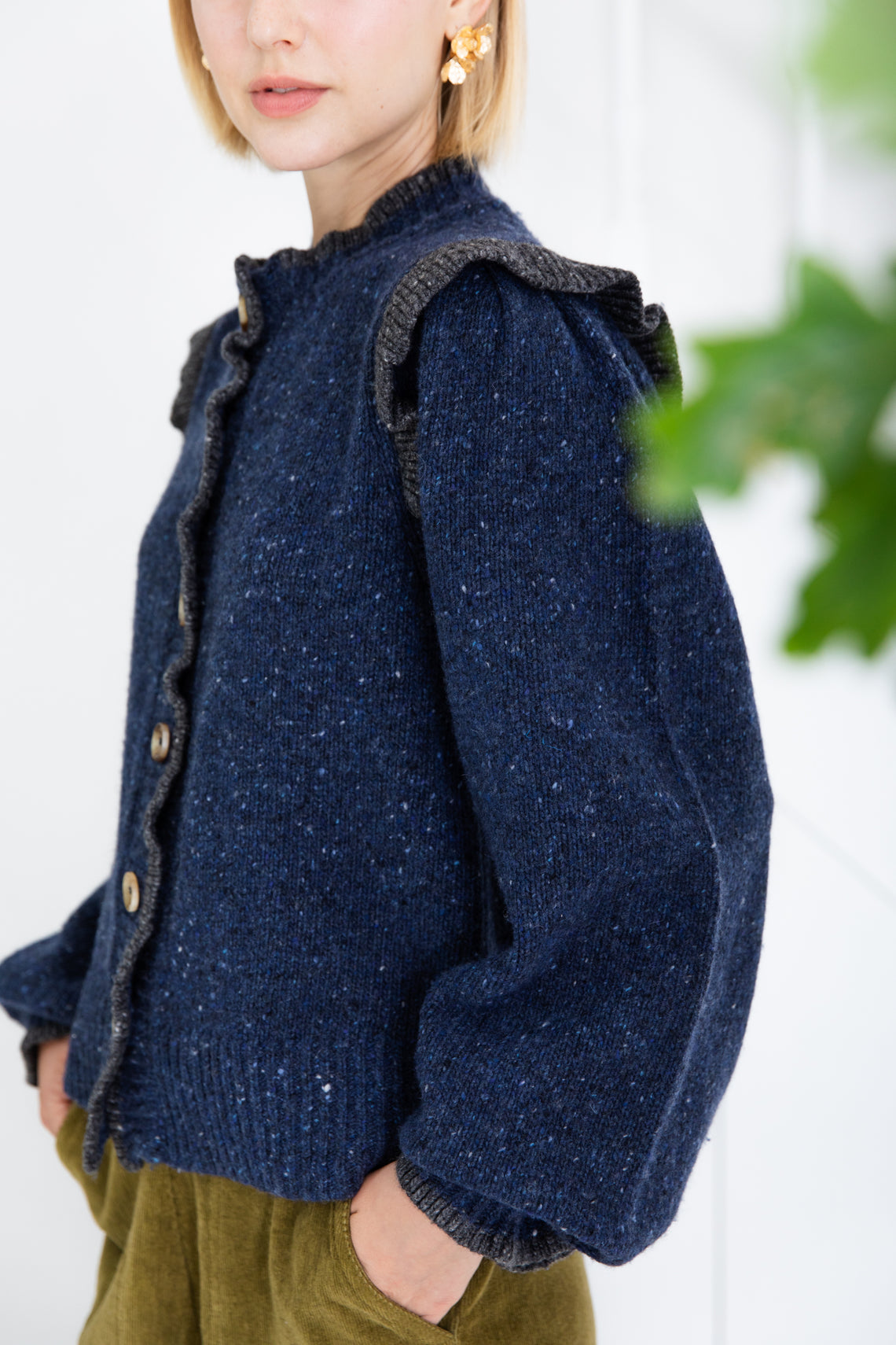 The sleeve is voluminous and features a feminine frill at the armhole in a tonal contrast colour. The cuff is ribbed with a delicate contrast tipped frill edge.