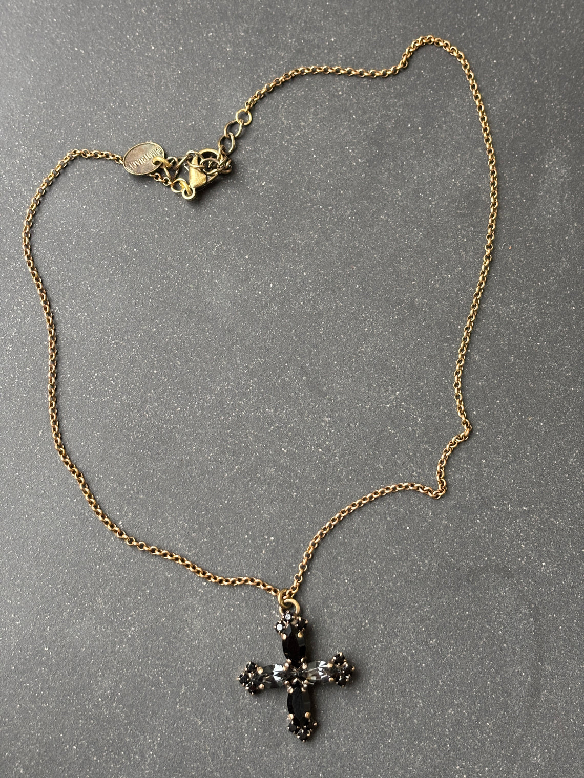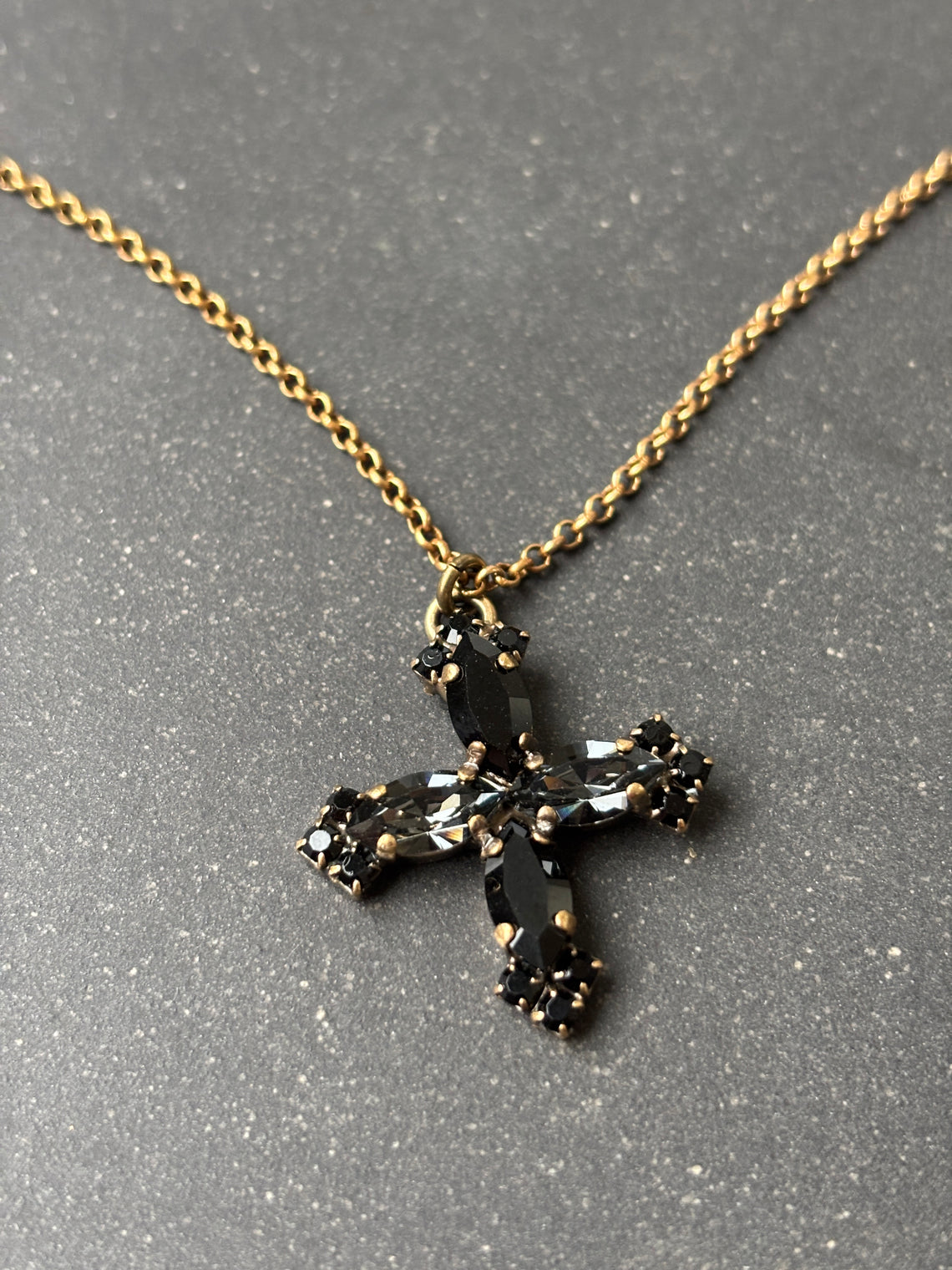 A beautiful cross necklace with black rhinestones. We love this small but bold piece and know that it will add an impact to any outfit.
