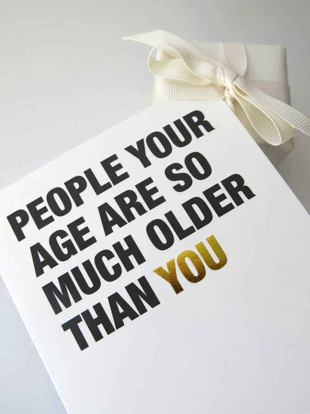 White card with gold statement.