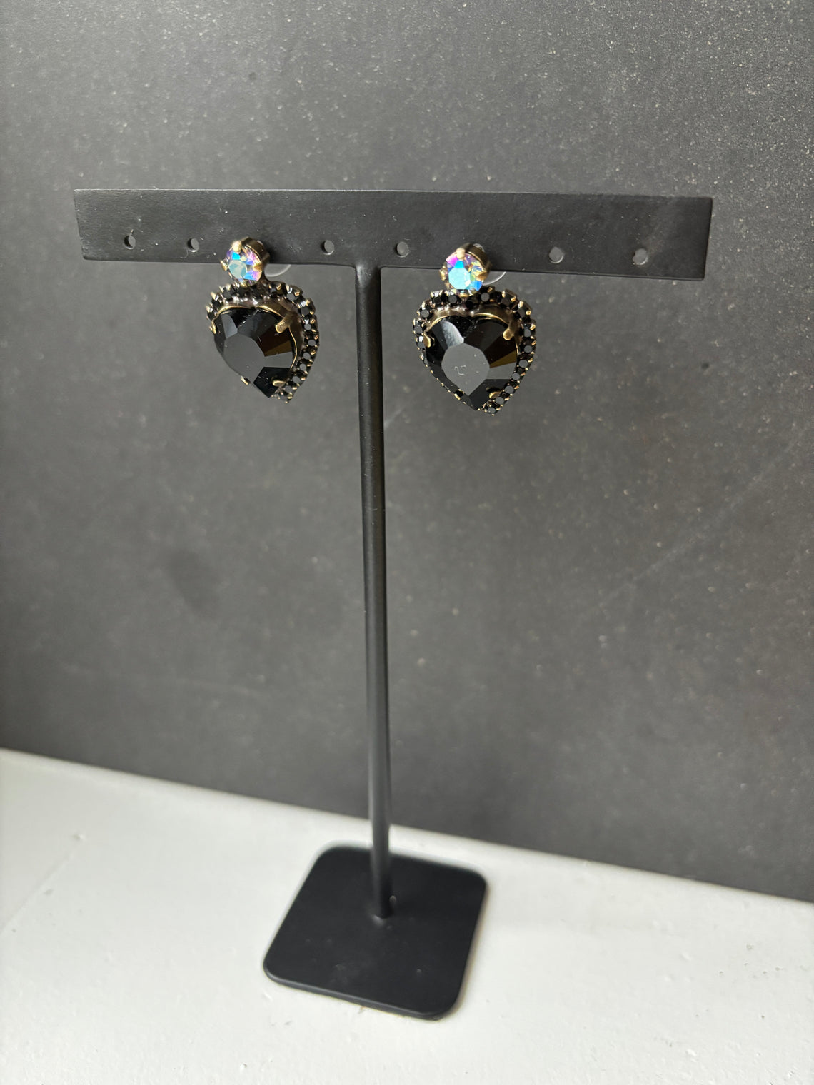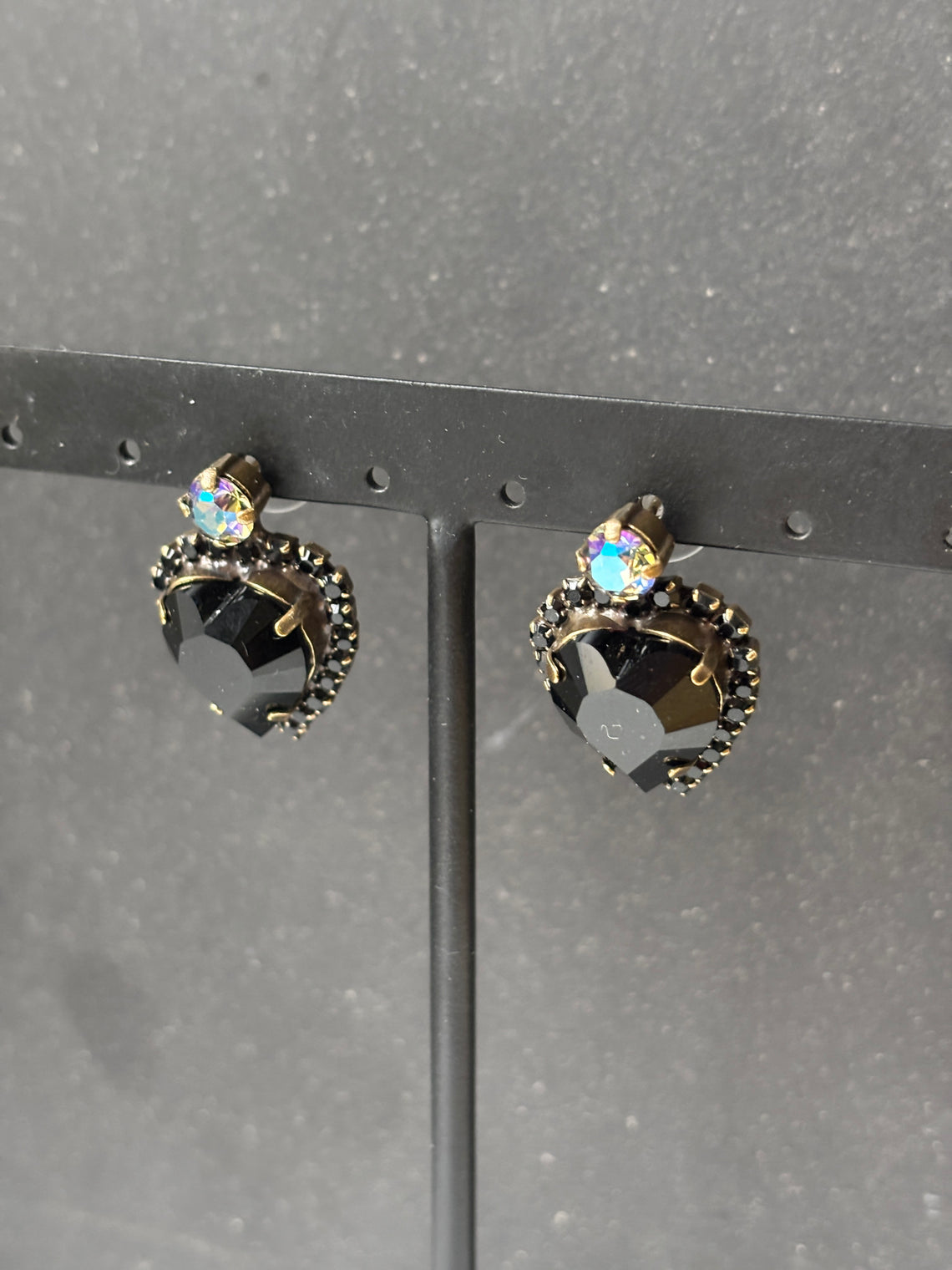 These small heart earrings will a pretty addition to any wardrobe. Made with small black rhinestones that glisten in the light, these earrings will be perfect day or night.