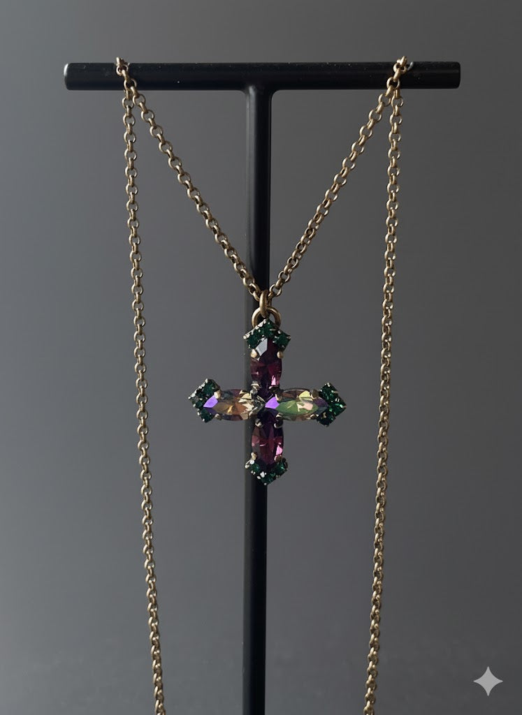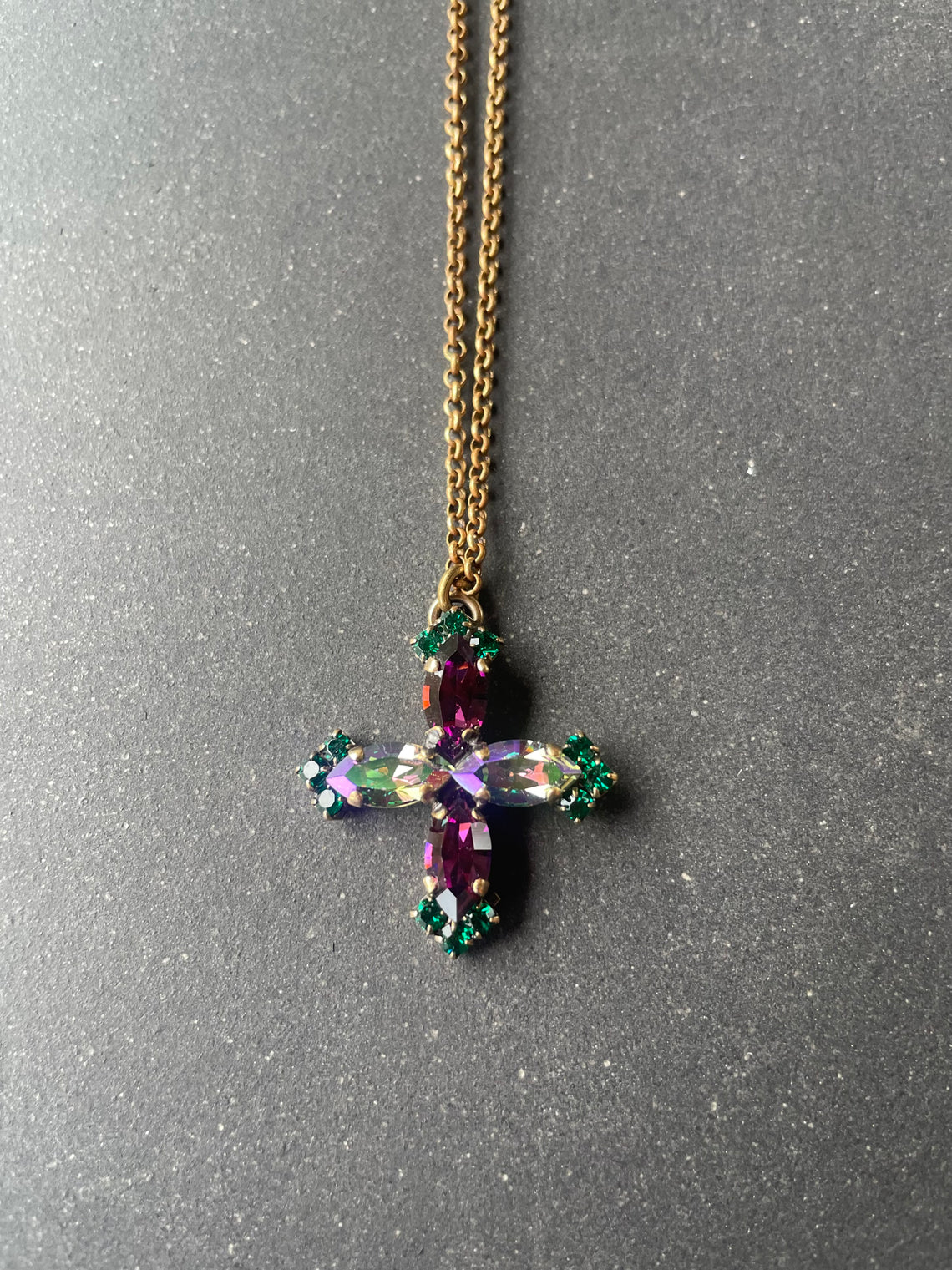 A beautiful cross necklace with shades of purple and green Swarovski crystals and rhinestones.