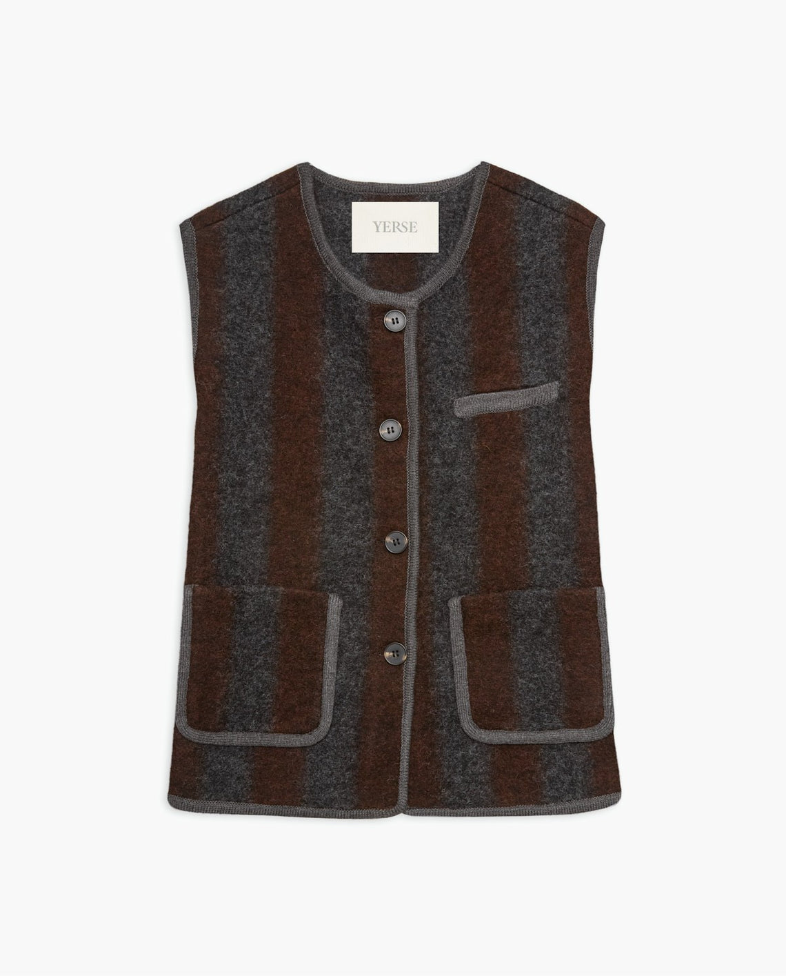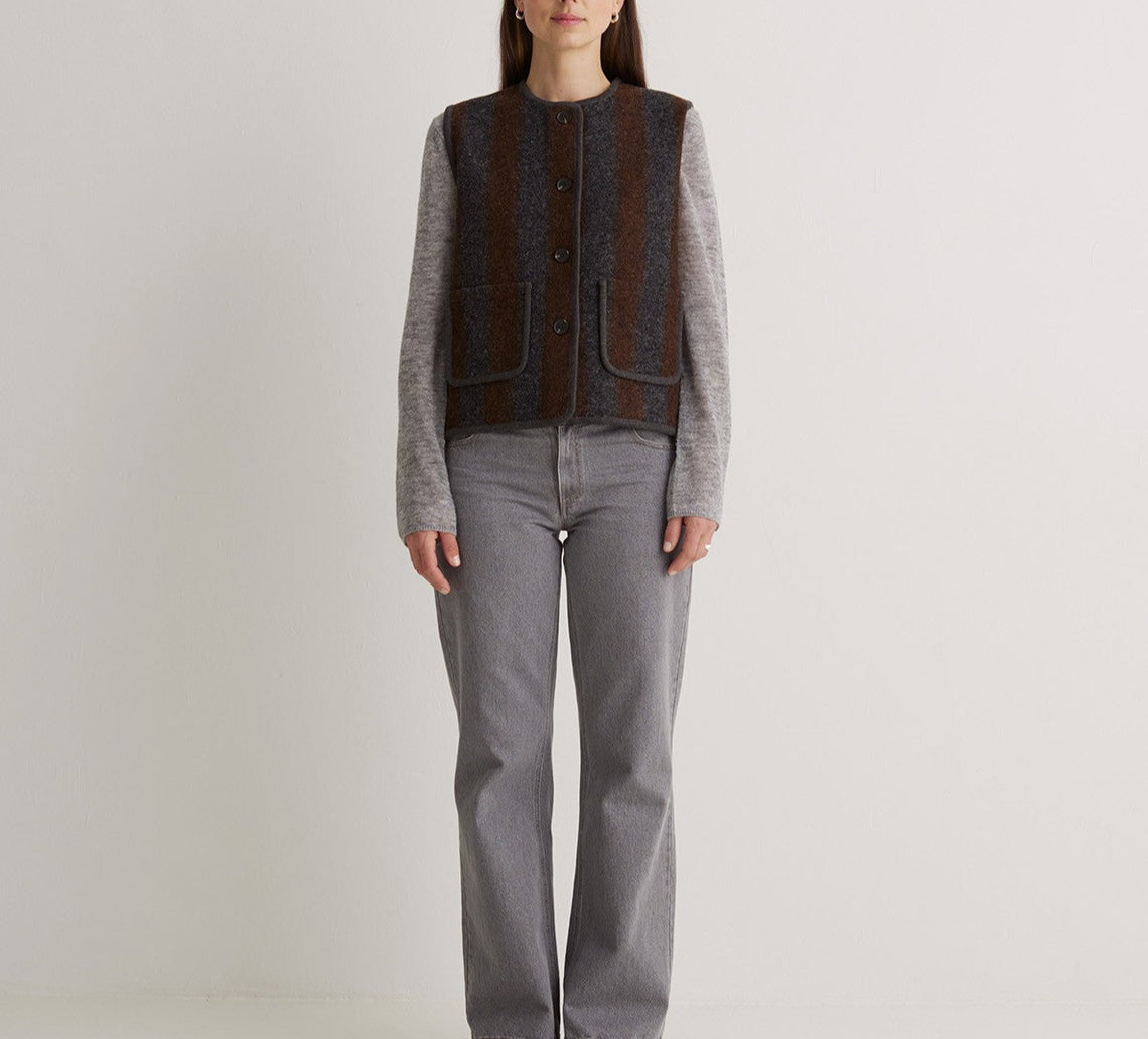 This gilet is has a round necklinewith faux-tortoiseshell buttons.