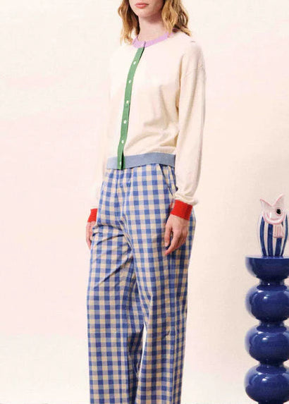 Knit cardigan with colour block details and central button fastening in a straight, fitted cut.