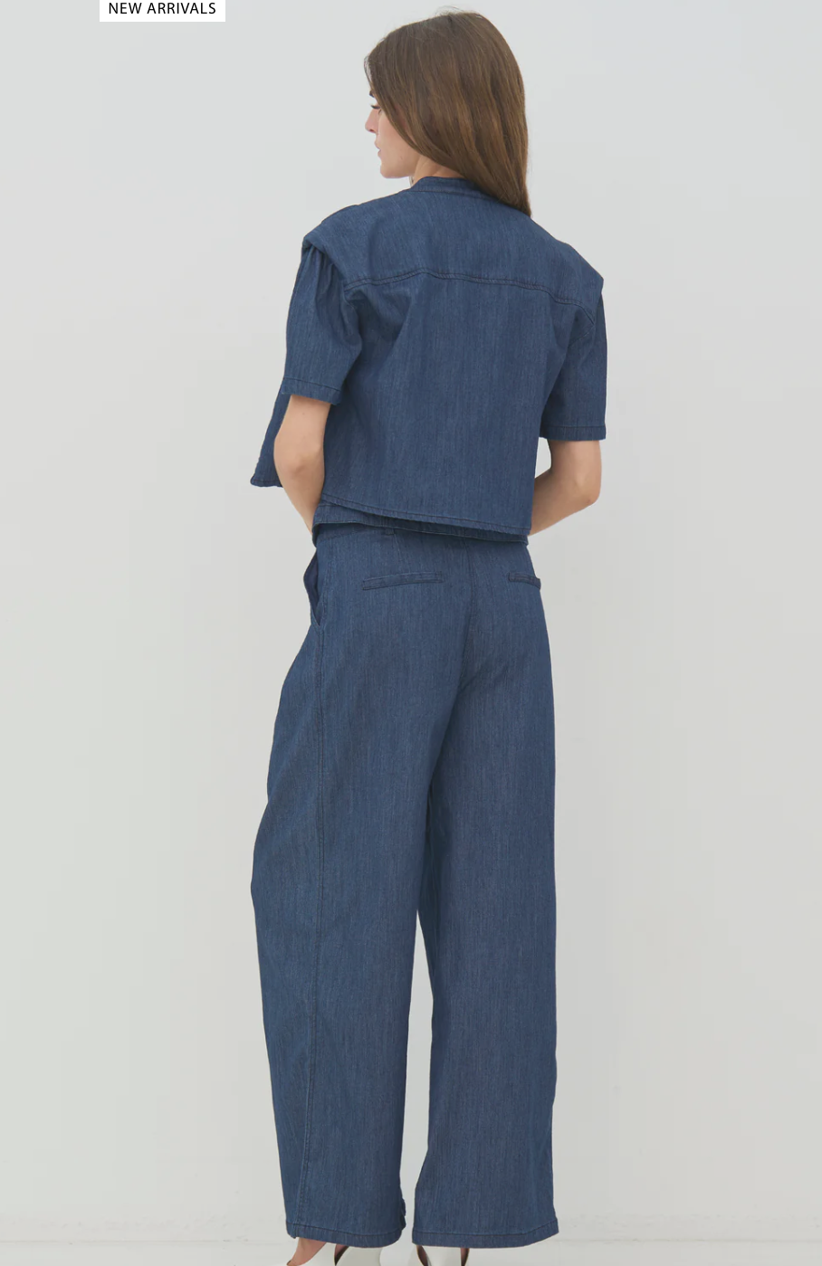This denim jacket has a short fit with short sleeves and a full-length zipper at the front.