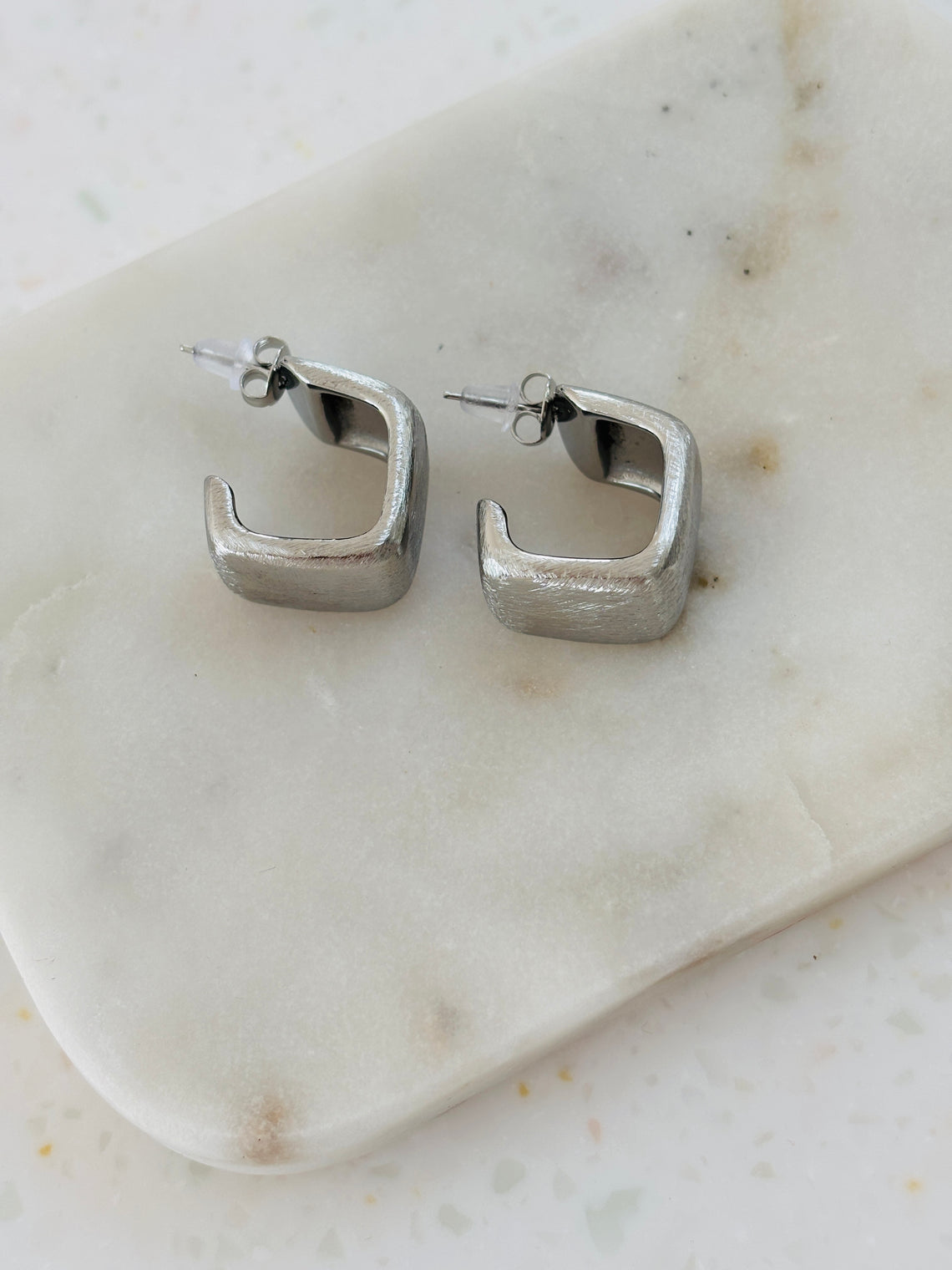 A beautiful pair of square shaped earrings, made from stainless steel with a silver finish.