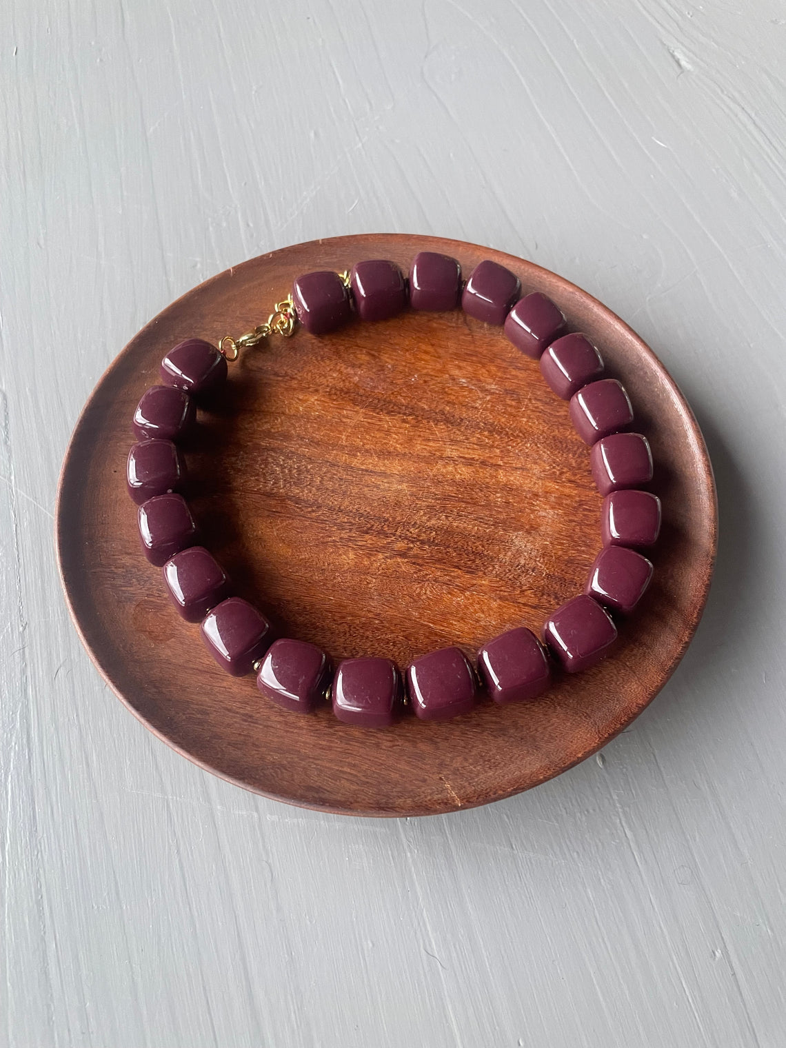 Each resin bead is following by a small gold bead and gold adjustable chain.