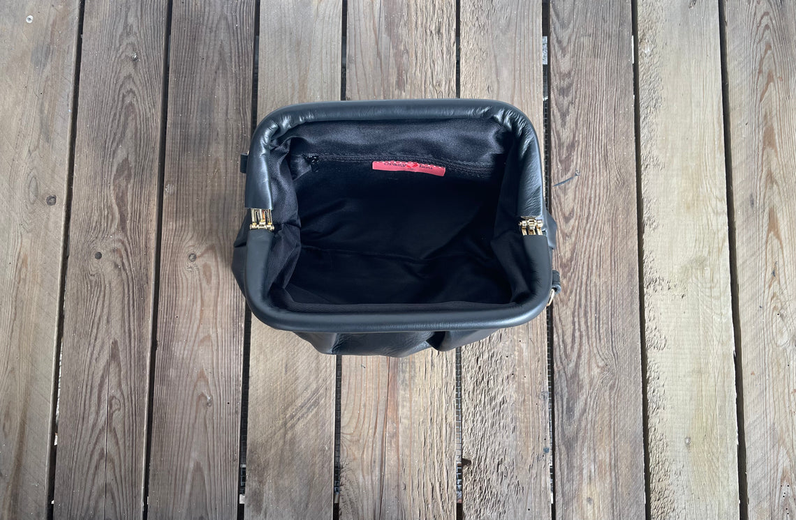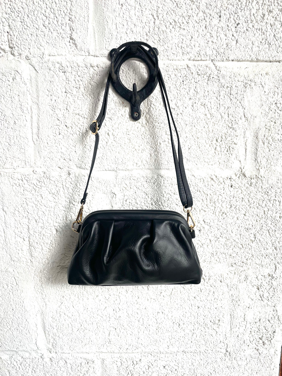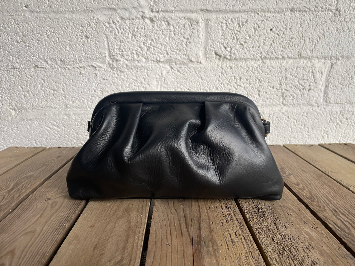 Black leather clutch bag with an adjustable shoulder strap.