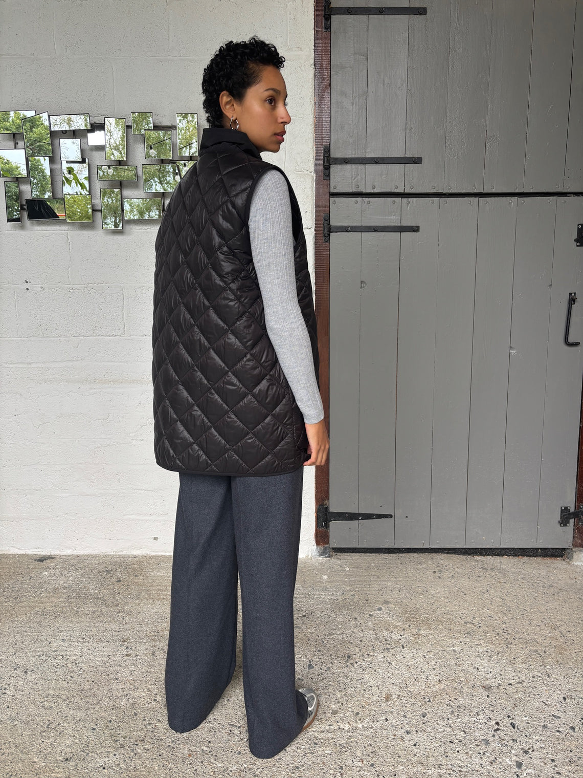 The sleeveless quilted gilet is removable and has a mao collar and button-down front can be worn over or under the full coat or completely independently