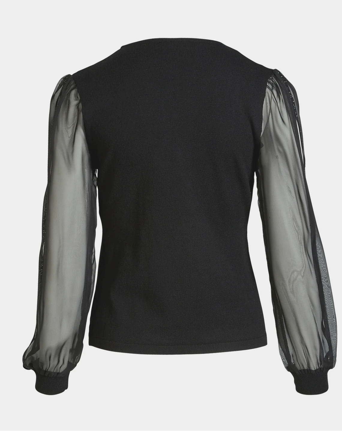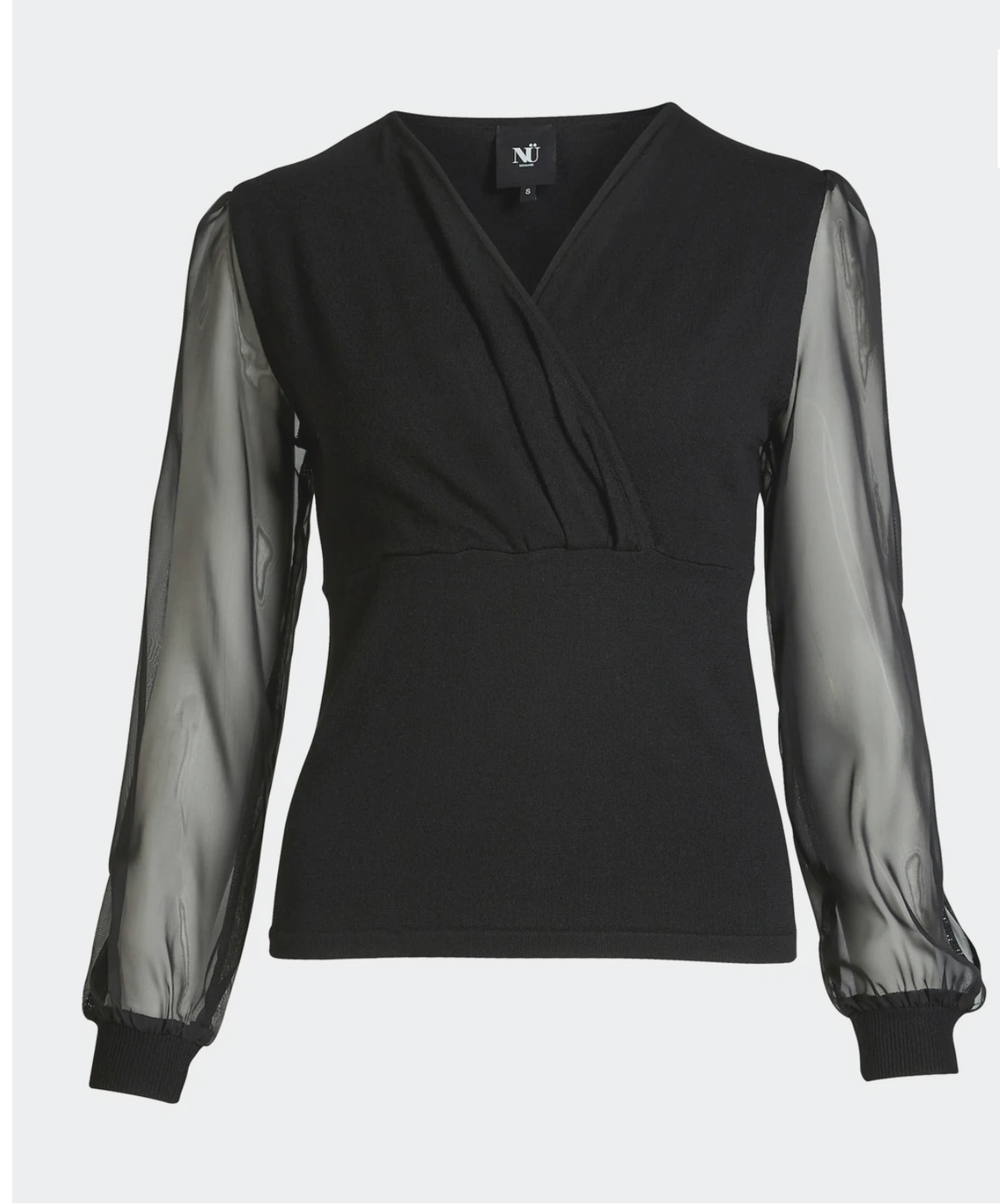 Add a feminine and sophisticated touch to your wardrobe with this knitted blouse. It features a flattering wrap-around effect at the front and soft, sheer balloon sleeves that create a delicate contrast to the tightly woven knit quality of the body. The ribbed cuffs complete the design and ensure a good fit.