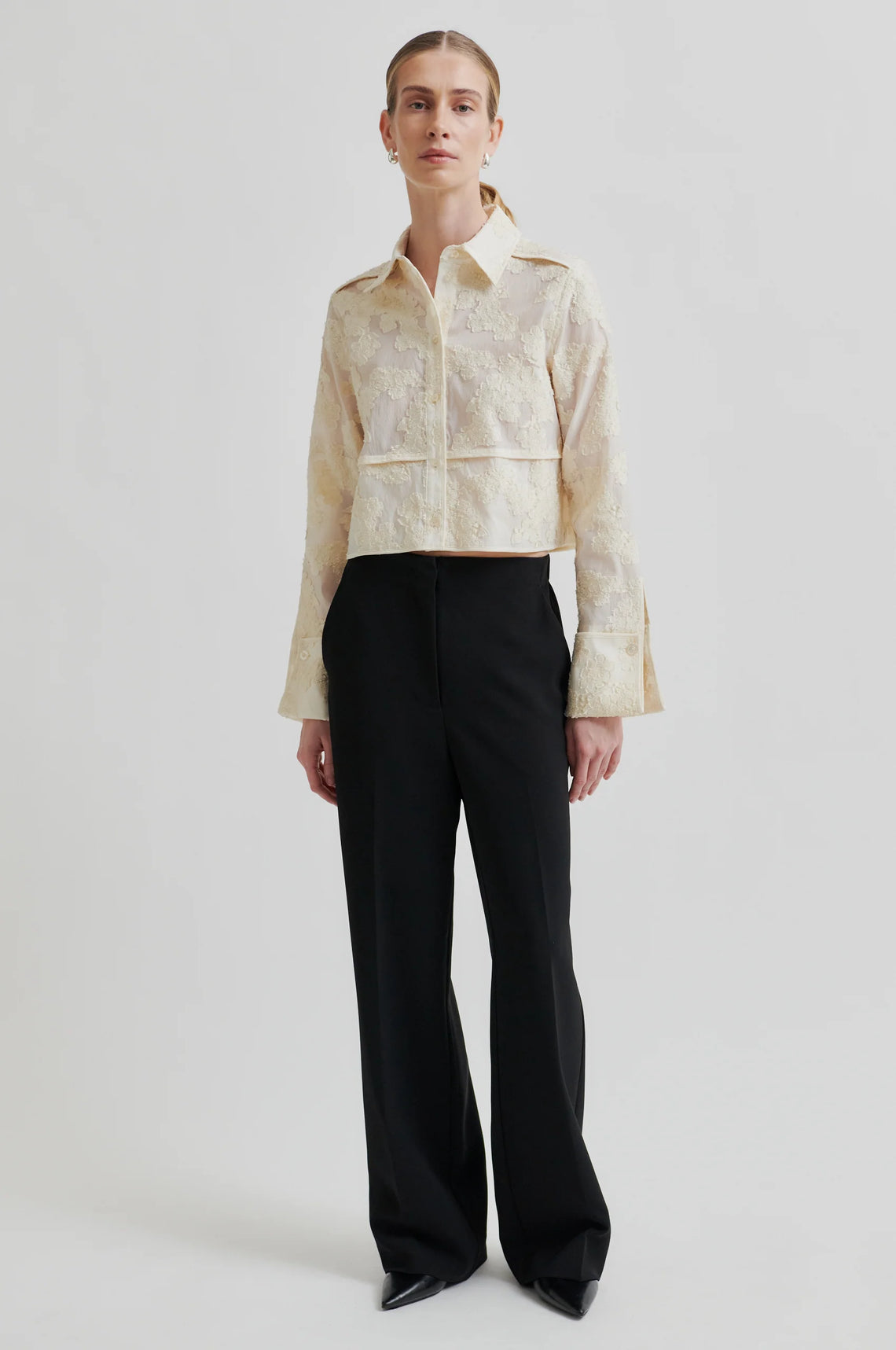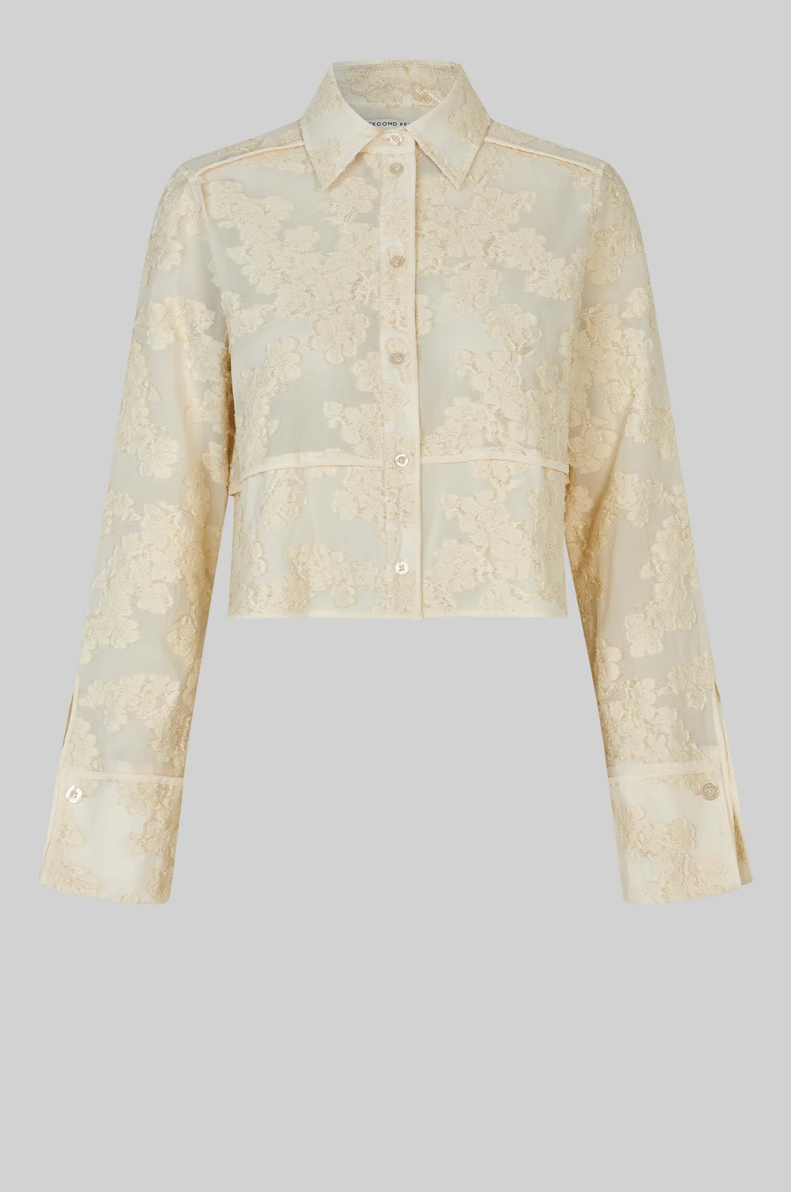 This shirt is made in a cotton blend with all-over tonal floral embroidery that creates a 3D effect.