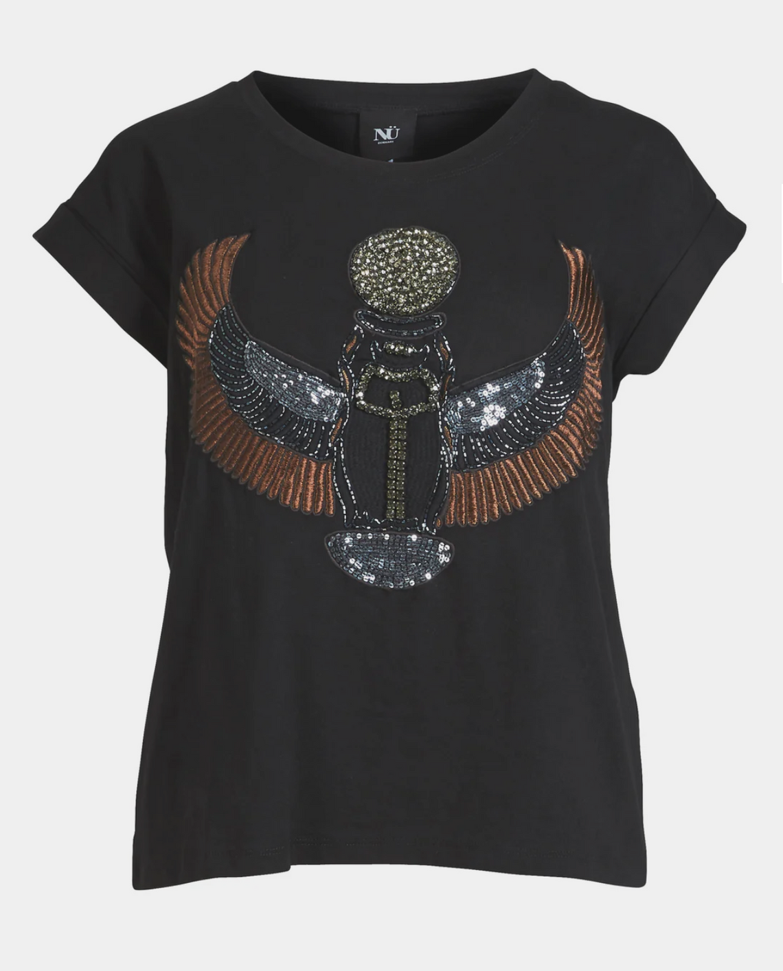 This t-shirt features a striking design of a bird with a large decorative front application in sequins and embroidery, providing a unique and sparkling expression.